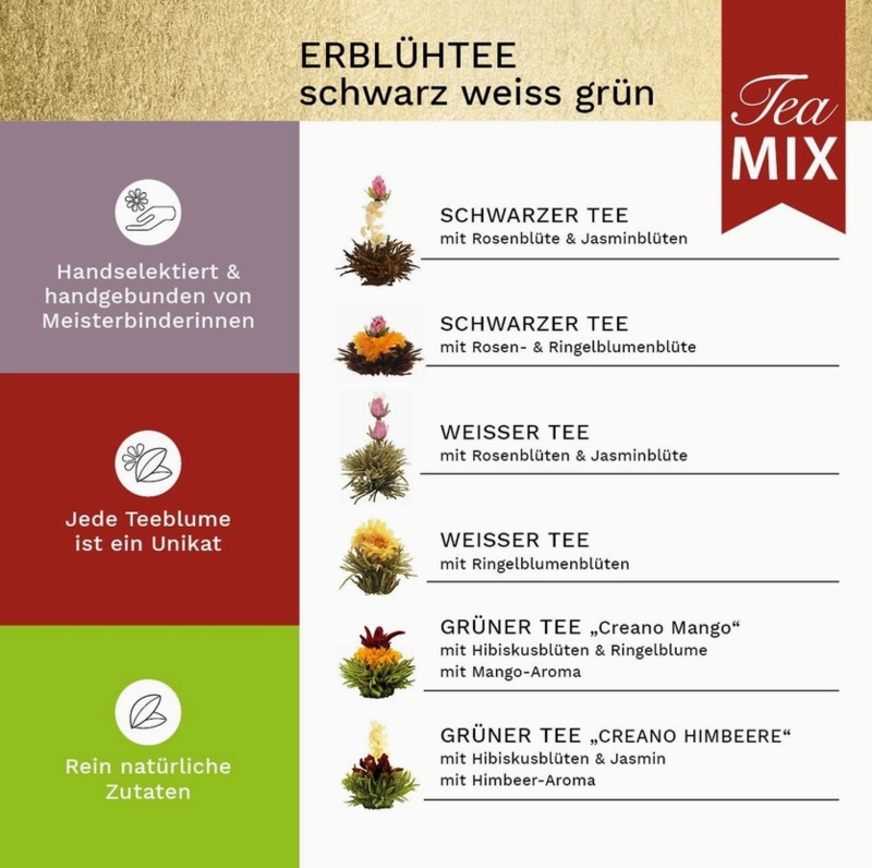 Het pakket bevat: 6x ERBLÜHTEE MIX (zwarte thee, witte thee, groene thee) Theepot van 500 ml