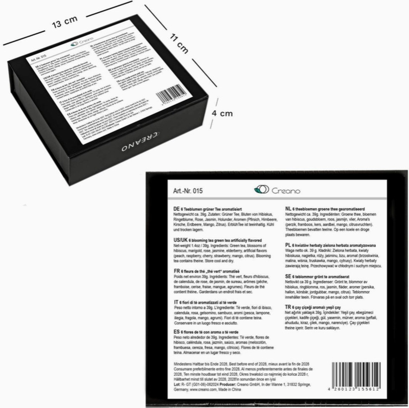 Creano theebloemmix van 6 bloeiende bloemen van „groene thee” in elegante cadeaudoos.